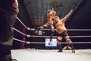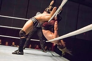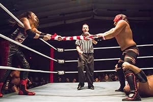 During Palace’s entrance there seemed to be an issue with some fans at ringside as members of the IWC Security Staff were crowding in one corner of the barricade. When Palace walked over to see what was happening he was blindsided by the Staff members! Confusion filled the building until the faces of the Staff members could be seen… It was Team Storm! Jaxon Argos and RC Dupree ganged up on Palace as Jack Pollock