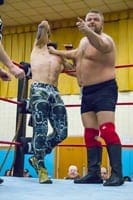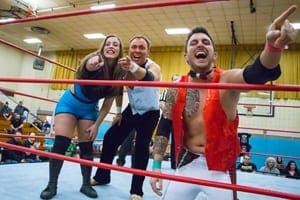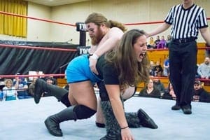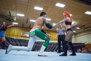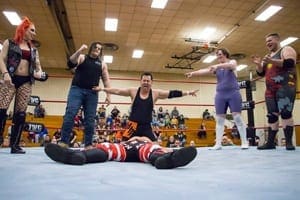 In six-person tag team action, Katie Arquette & Calvin Couture teamed up with their recent BFF, Mambo Italiano, to take on “Bearcat” Keith Haught, “Five-Alarm Fire” Jason Tyler, and “Bloody Adorable” Jinx. It seemed like the devious trio was going to pull out the victory, but Tyler & Haught launched Jinx off the top rope onto Couture to give her team a huge victory!