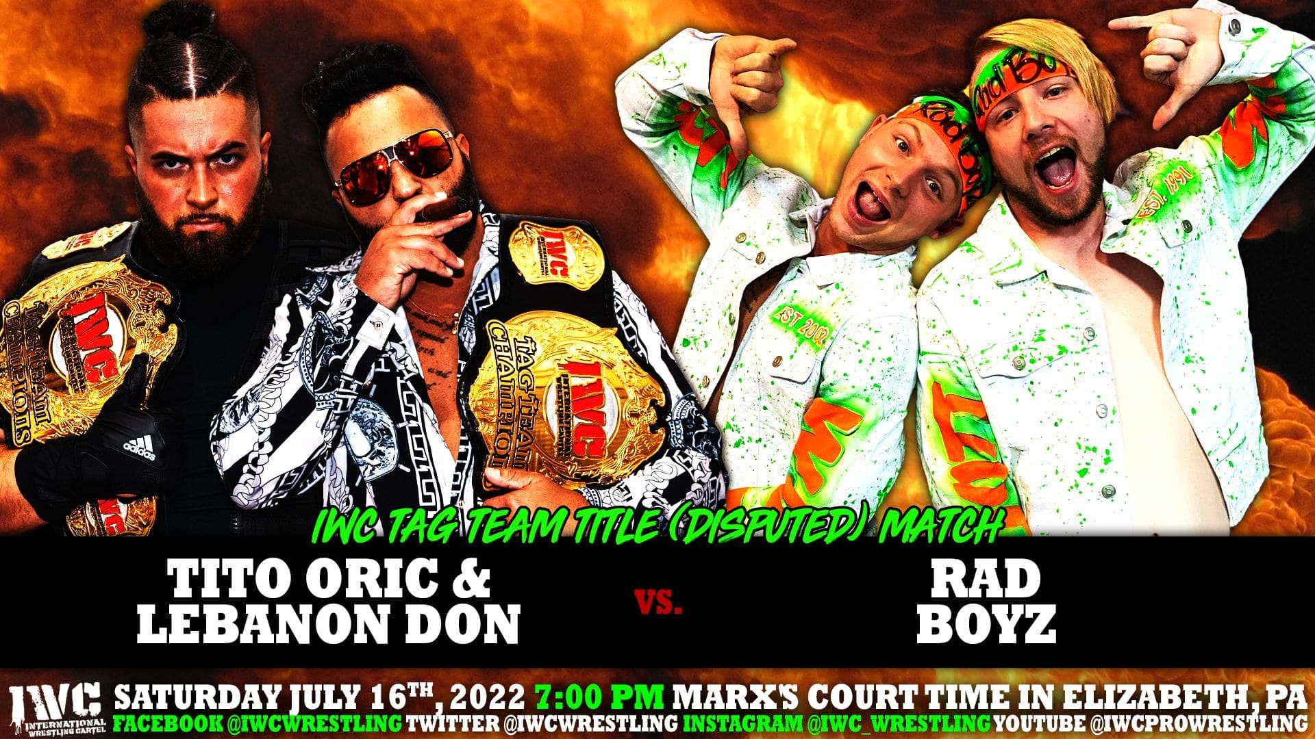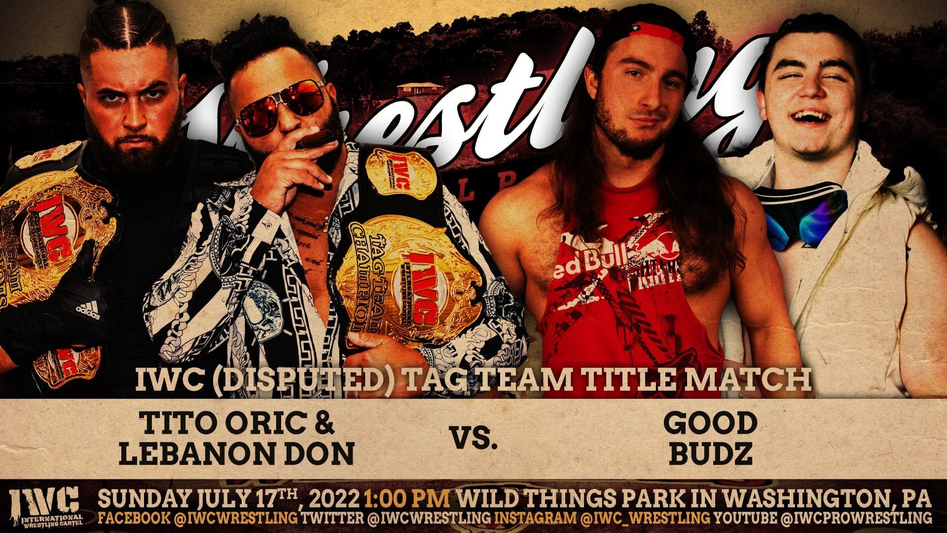 he IWC (Disputed) Tag Team Titles could be on the line at back-to-back events this weekend. If Tito Oric & Lebanon Don retain their Disputed Tag Team Titles at IWC Threat Level Midnight on July 16th, they will have to defend them against the Good Budz at Wrestling at the Ballpark on Sunday July 17th. If Tito Oric & Lebanon Don lose their titles this match will be a Non-Title Match. Either way, a victory for the Good Budz would certainly push them to the front of the line!!