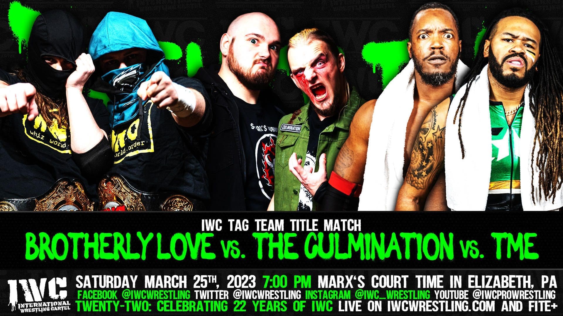 AtThe card is always subject to change! Now at IWC Wrestling ft. X-Pac! on March 25th, TME will join the tag team title match in the second half of our double main event! If TME wins, they will set the record for most IWC Tag Team Championship reigns in our 23 year history! Can they do it?